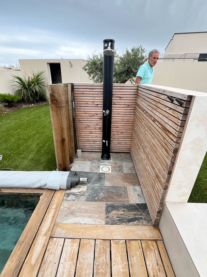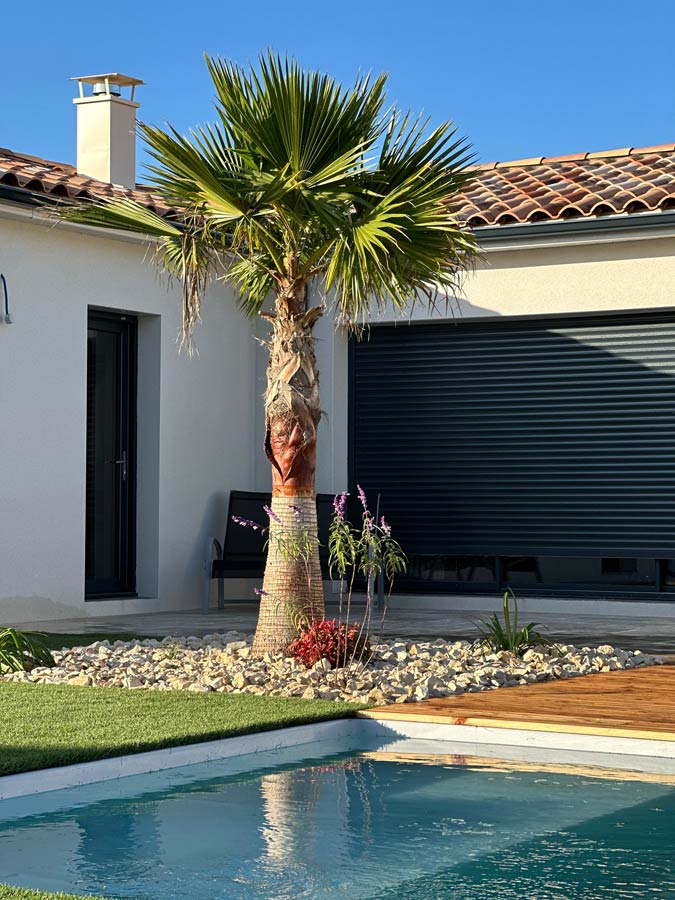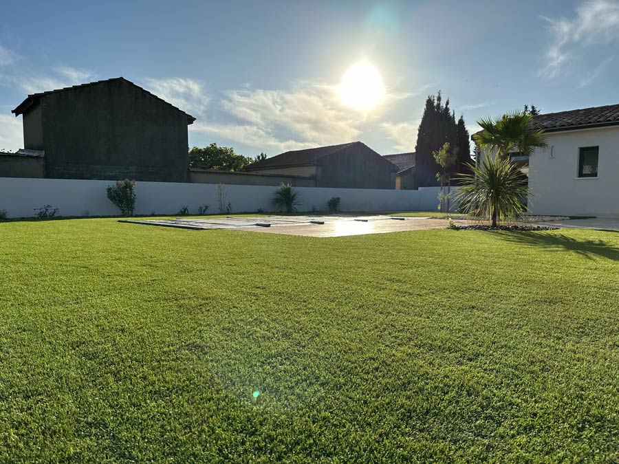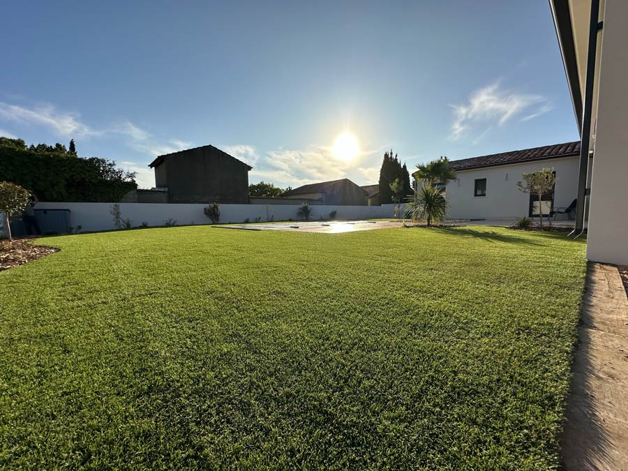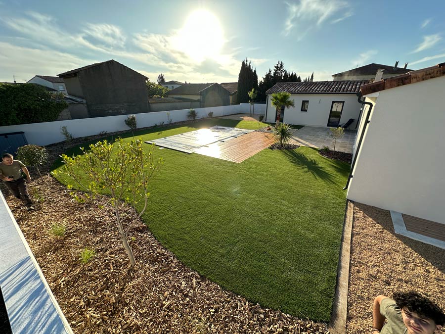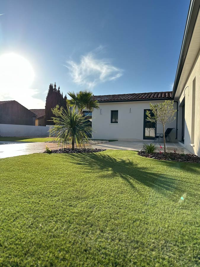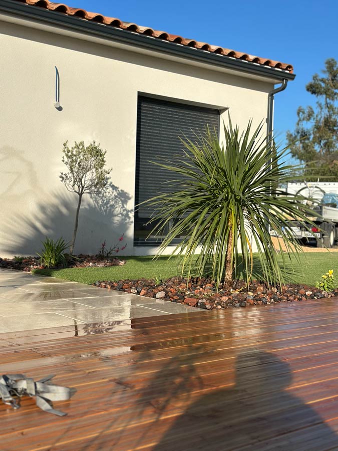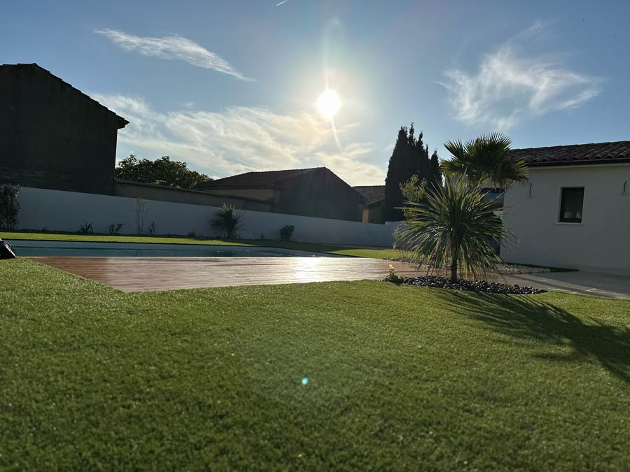 L’équipe intervient dans tout le Biterrois et concrétise des aménagements complets : terrasses bois, gazon synthétique, voiles d’ombrage, résine extérieure, massifs minéraux, plantations, éclairage ou arrosage automatique.