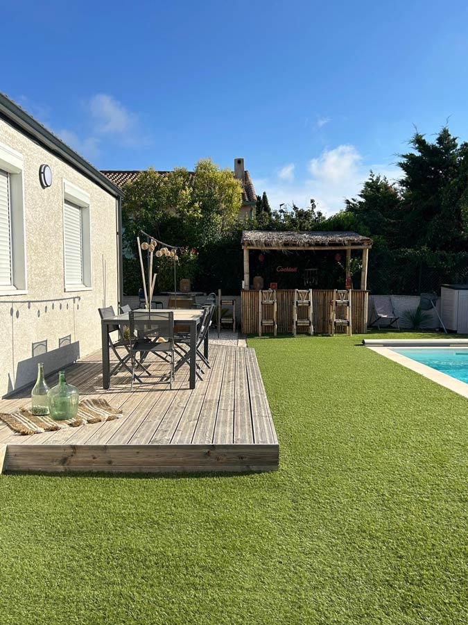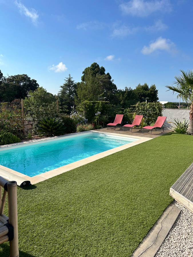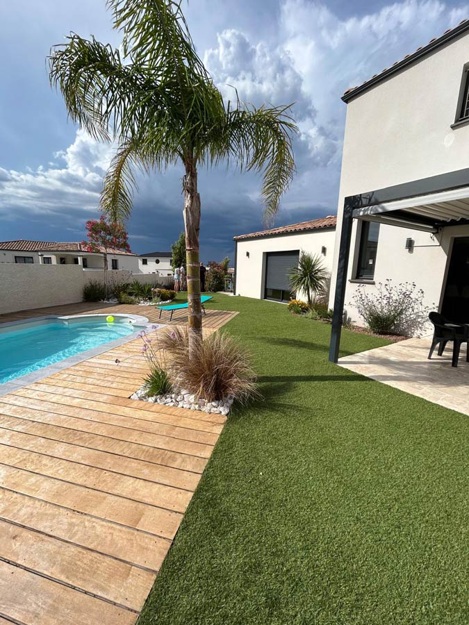 Tout est conçu et posé par l’équipe interne. Seule la piscine est confiée à un partenaire, mais intégrée dans le projet global.