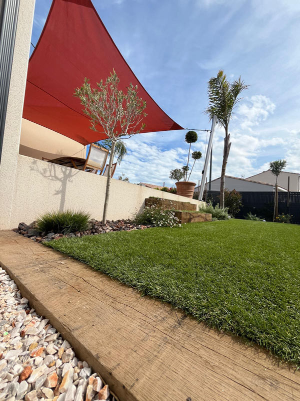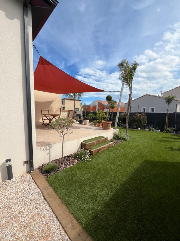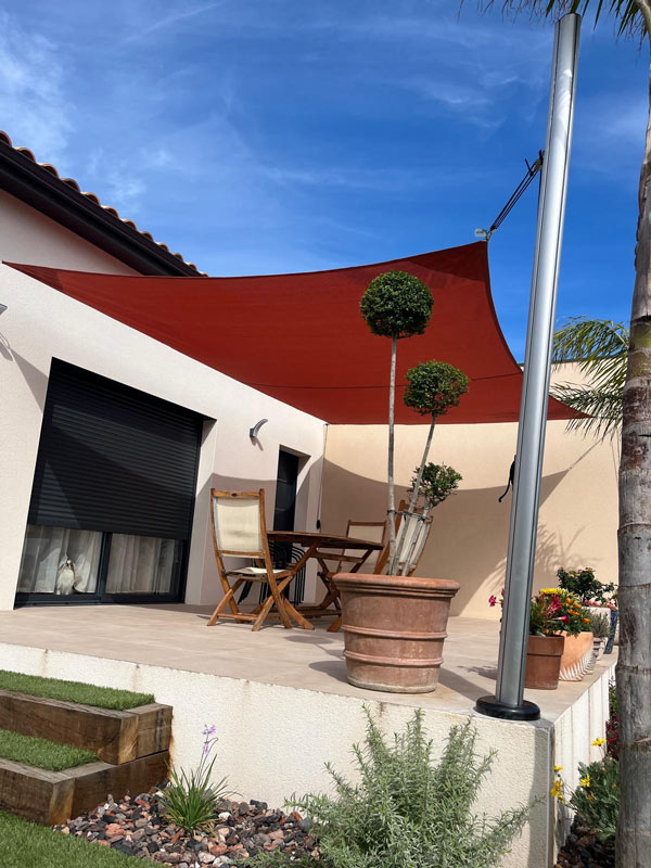 Leur structure robuste permet de créer une zone d’ombre plus large, tout en s’intégrant parfaitement aux ambiances méditerranéennes (graviers, minéraux, végétaux résistants, massifs secs…).